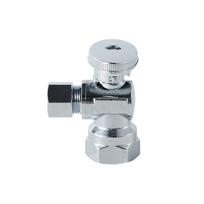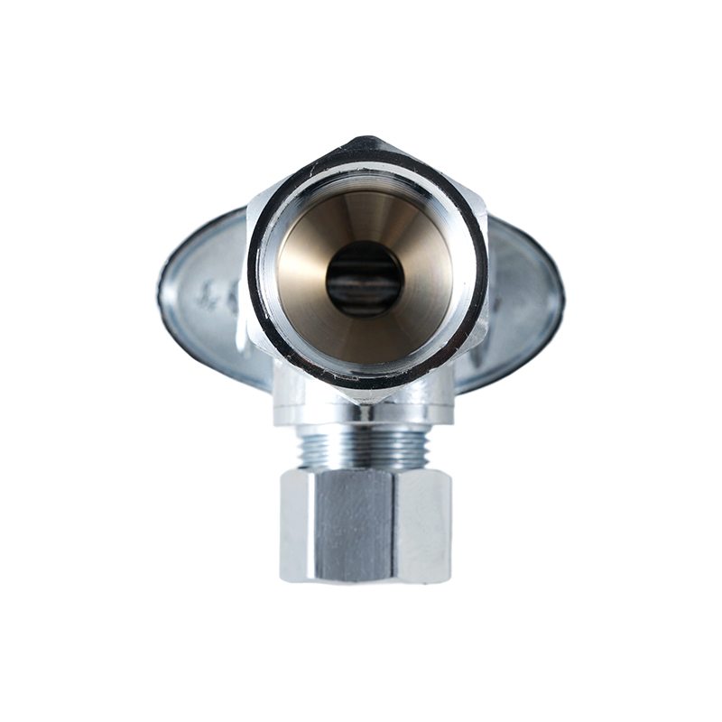 Esta válvula tiene una entrada y salida de 90 grados. Un extremo tiene una conexión de rosca de tubería hembra ANSI de 5/8 de pulgada para atornillar a la salida de suministro de agua en la pared; el otro extremo tiene una conexión de diámetro exterior de 3/8 de pulgada para conectar una manguera flexible a un dispositivo (como un inodoro o fregadero).